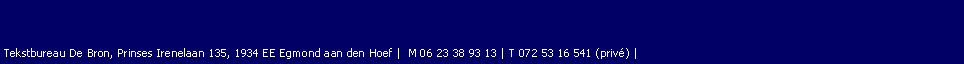 Tekstbureau De Bron Sandra Lam Prinses Irenelaan 135 1934 EE Egmond aan den Hoef 06 23 38 93 13 072 53 16 541 (privé) KVK: 51432366 Algemene voorwaarden op aanvraag. |